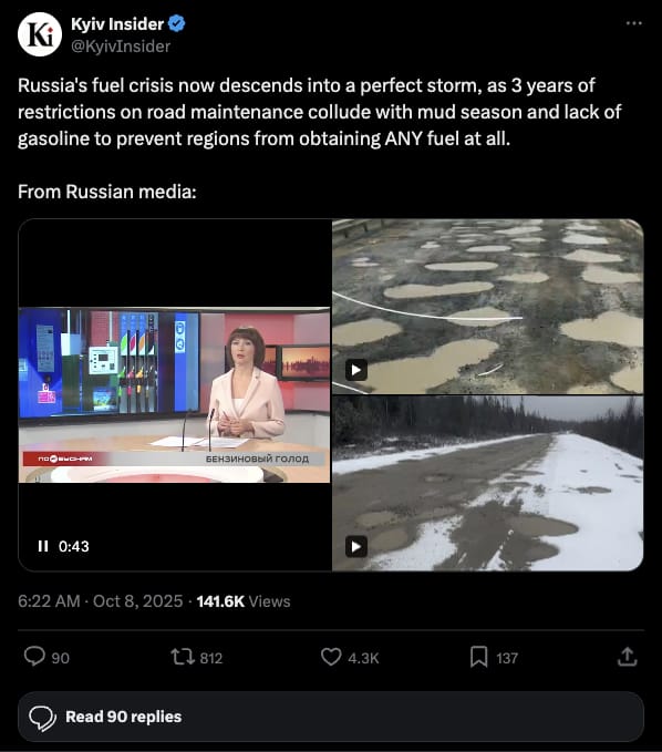 Russia's fuel crisis is exacerbated by years of neglected road maintenance, the onset of mud season, and a lack of gasoline, creating a perfect storm that is hurting the ability of certain regions to obtain fuel. If you watch the videos, I would guess these trucks are traveling between one and three miles per hour, when they would typically be traveling 50-70 miles per hour, road permitting. That’s somewhere between 1/70th and 3/50ths as fast as trucks would normally be moving fuel and equipment. That’s a huge hit to transport, and it didn’t even require direct intervention to achieve. It’s just a side effect of negligence.