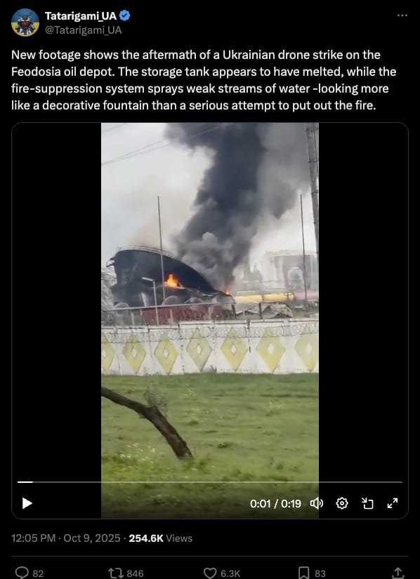 After another attack on the Korobkovsky Gas Processing Plant and the Yefimovka dispatch station in Volgograd region, there was footage following a Ukrainian drone attack on a Feodosia oil depot that shows severe damage, with a storage tank melted and an ineffective fire-suppression system. This adds some credence to the idea that the heat is so intense it will not only melt weak metal welds but also entire structures.