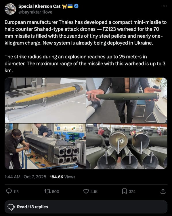 Thales, a European manufacturer, has introduced the FZ123 warhead for the 70 mm missile, designed to counter Shahed-type drones. This new system, with a strike radius of up to 25 meters using small steel pellets, is already being deployed in Ukraine. These are similarly low-cost to the Sting, but faster and potentially lower cost, depending on how the guidance works. The real advantage is that these systems can be deployed on lightweight vehicles.