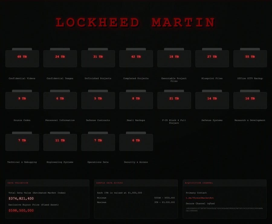 Lockheed Martin suffered a potentially huge breach, with 375TB of data offered for sale on a Russian Threat Market for $598 million. That is the kind of thing that could really hurt them both in future military contracts. It also means that all Lockheed Martin airframes and missile systems are potentially very vulnerable, because how they are made can now be scrutinized.