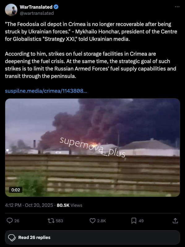 The Feodosia oil depot in Crimea is no longer recoverable after being struck by Ukrainian forces, according to Mykhailo Honchar, president of the Centre for Globalistics "Strategy XXI." Strikes on fuel storage facilities in Crimea are deepening the fuel crisis and limiting the Russian Armed Forces' fuel supply capabilities and transit through the peninsula.