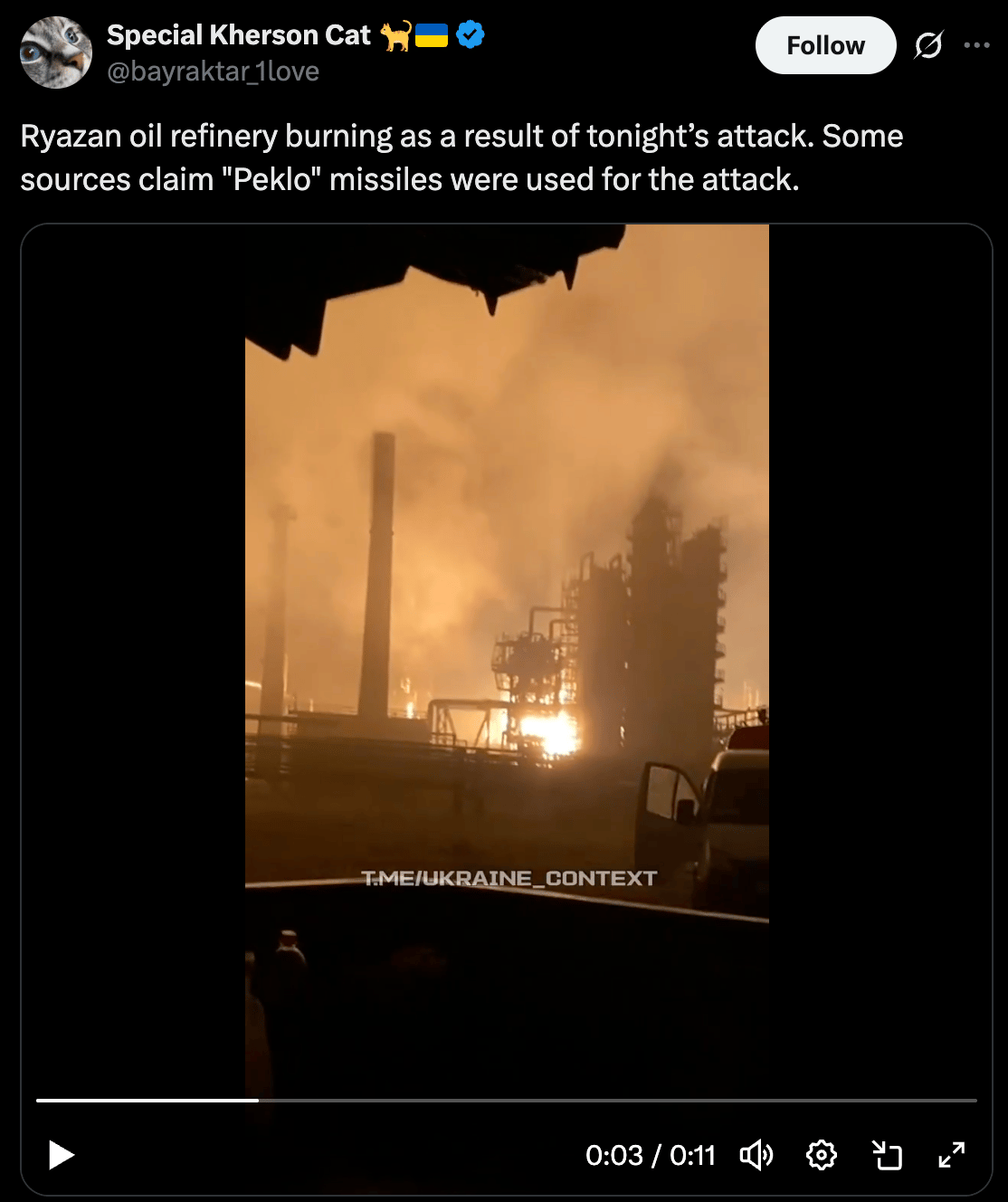 The Ryazan oil refinery is burning following an attack, with some sources claiming "Peklo" missiles were used.