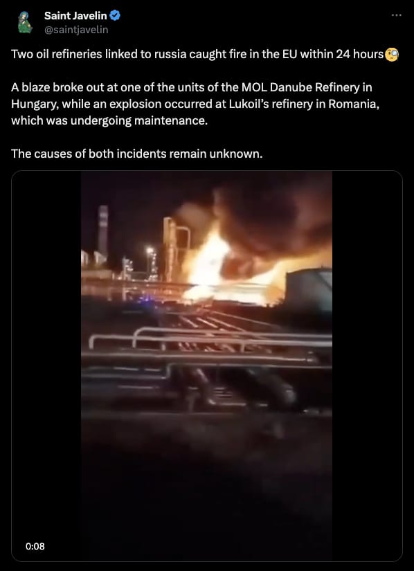 In European news, two oil refineries linked to Russia caught fire in the EU within 24 hours. A blaze broke out at one of the units of the MOL Danube Refinery in Hungary, while an explosion occurred at Lukoil's refinery in Romania, which was undergoing maintenance. While we don’t know how they happened, I don’t think there is much likelihood that it’s not Ukraine. In a way, though, this is an attack on NATO, because Hungary and Romania are both NATO countries. I doubt this will be used as a means to start a conflict with Ukraine, but… technically, there is a requirement to act if it does turn out to be a nation-state, regardless of which nation did it.