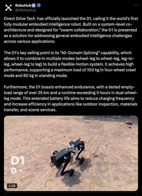 More on the militarized side, Direct Drive Tech launched the D1, the world's first fully modular embodied intelligence robot, designed for swarm collaboration and featuring "All-Domain Splicing" capability for flexible motion systems. The D1 supports a maximum load of 100 kg in four-wheel crawl mode and 80 kg in standing mode, with a tested empty-load range of over 25 km and a runtime exceeding 5 hours in dual wheel-leg mode. At first, I didn’t see this as particularly useful, but the more I thought about it, the more I think it does have some real uses. First of all, it gives you the ability to repair by replacing parts. Second, by breaking up into parts, it becomes more portable by smaller aerial drones. Lastly, for recon, it might be hugely beneficial to be able to break up into smaller drones so that more area can be covered quickly, and then recombined later.