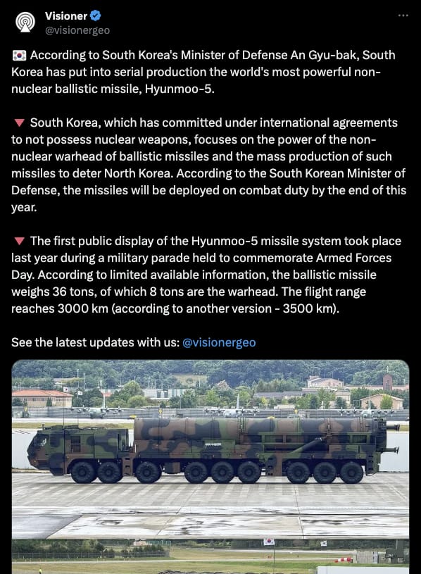 In South East Asia news, South Korea has put into serial production the world's most powerful non-nuclear ballistic missile, the Hyunmoo-5. The 36-ton missile, with an 8-ton warhead and a flight range of 3000-3500 km, will be deployed on combat duty by the end of the year to deter North Korea, according to South Korea's Minister of Defense An Gyu-bak. I really like this way of thinking. It is easily large enough to destroy most non-hardened and even many hardened structures, and avoids nuclear escalation in the process.