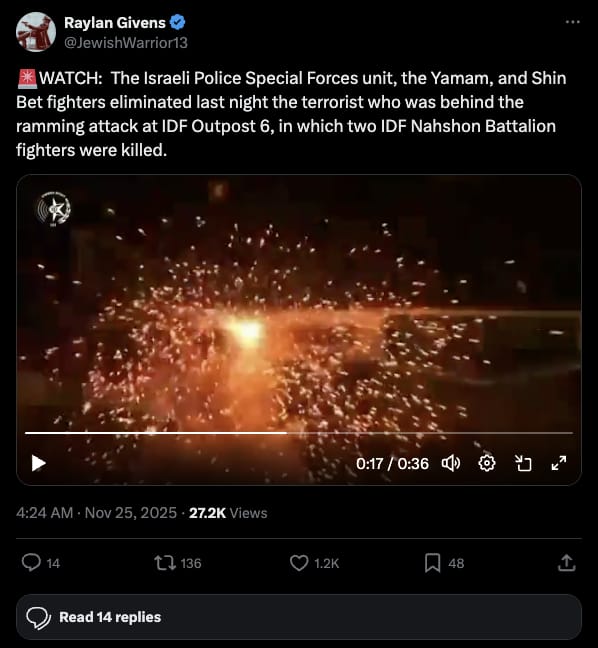 Speaking of, Israeli Police Special Forces unit Yamam and Shin Bet eliminated the Hamas terrorist behind the October 6 ramming attack at IDF Outpost 6 that killed two Nahshon Battalion fighters.