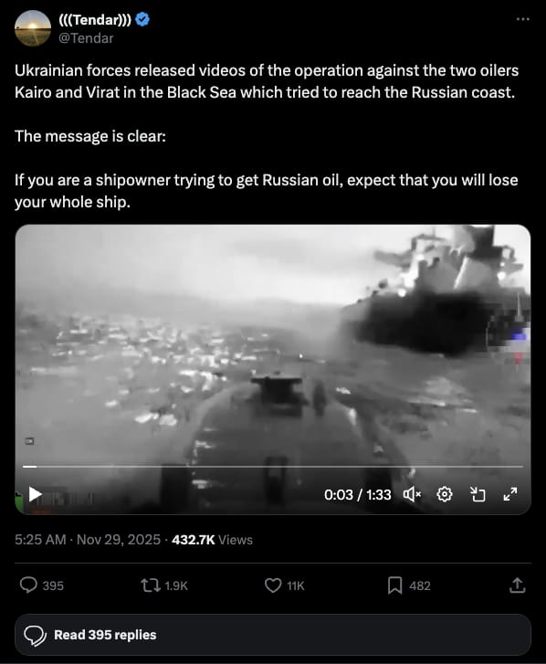 Ukraine's Security Service operated Sea Baby naval drones to strike two sanctioned Russian shadow fleet tankers, Kairo and Virat, in the Black Sea while empty and en route to Novorossiysk, engulfing both in flames and forcing crew abandonment, with the vessels likely to sink as a warning to shipowners transporting Russian oil. These are ecological disasters, and also a big blow to Russian oil transport, driving up prices, which is good, but also driving down profits, which is already dangerously low.