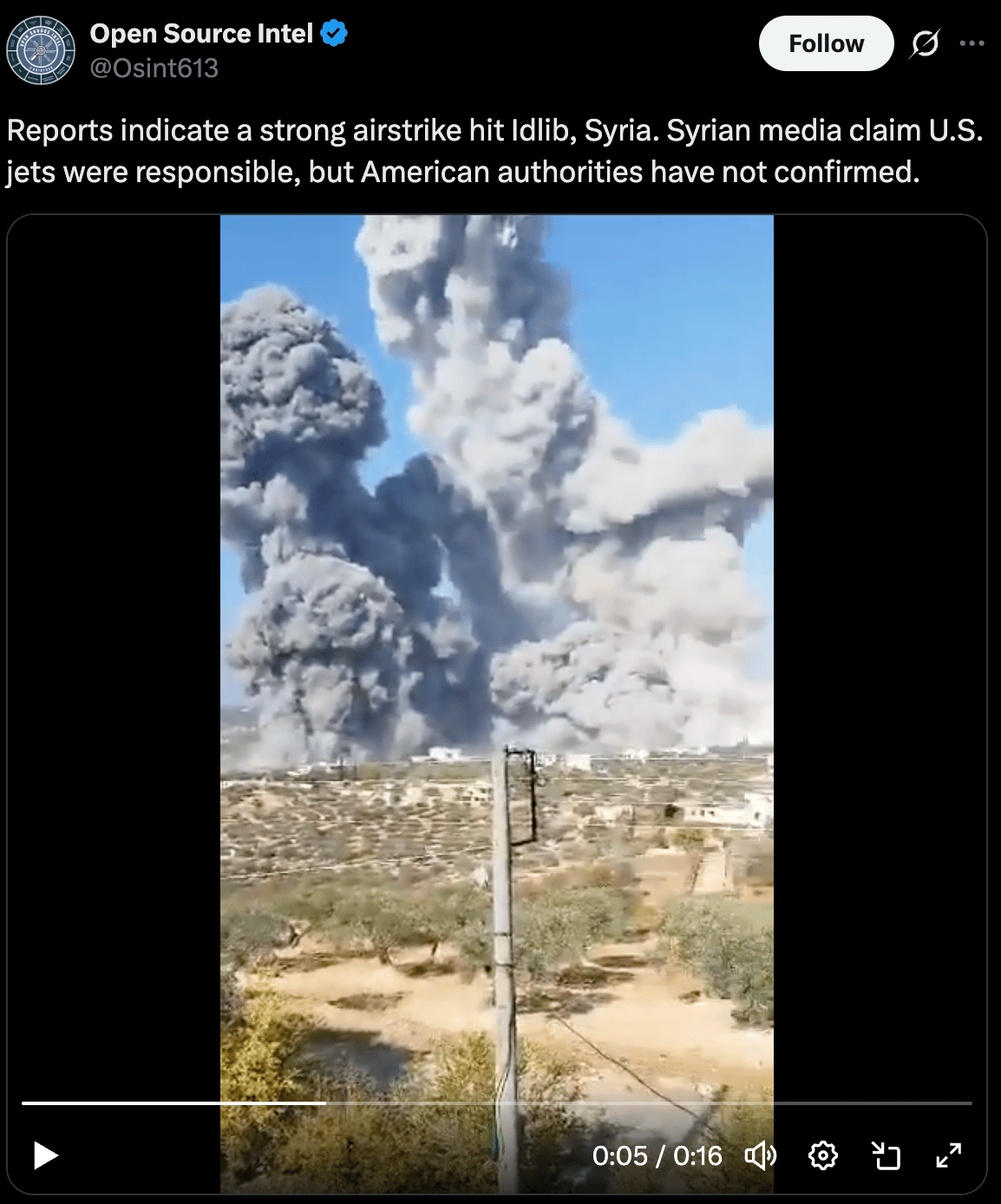 A strong airstrike hit Idlib, Syria, with Syrian media attributing it to US jets, though authorities have not confirmed. It could have also been US jets that have been donated/sold to Israel, which is slightly more likely, but we have been known to operate in Syria as well.