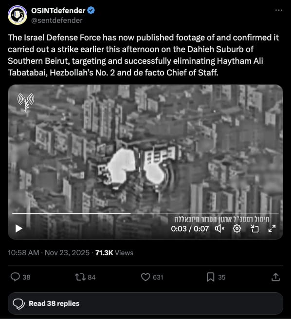 The Israel Defense Force struck the Dahieh suburb of southern Beirut, eliminating Haytham Ali Tabatabai, Hezbollah's No. 2 and de facto chief of staff. It just shows how long and tirelessly the IDF will seek out those who have attacked them in the past.