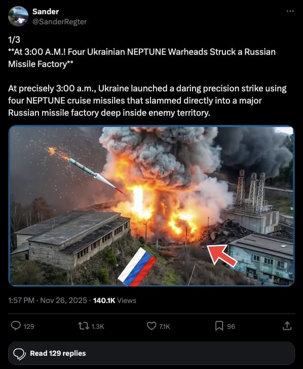 This is related to Ukraine’s launching of four Neptune cruise missiles at 3:00 a.m. to strike a major Russian missile factory deep inside the territory. In a separate Novorossiysk operation, drones hit a large Project 1171 landing ship near the naval base and an oil terminal.