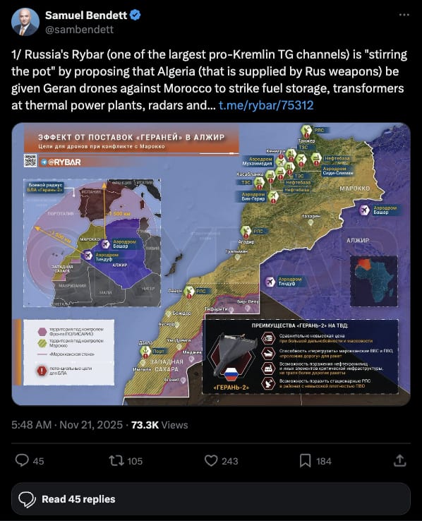 In African news, Russia's Rybar channel proposed supplying Algeria with Geran drones to target Moroccan fuel storage, power plants, and radars. So we may actually see the spillover of the Russian/Ukraine war in Morocco, which might actually be a fairly good distraction for the Russians while they enable allies in North Africa, and put France and Portugal within range.