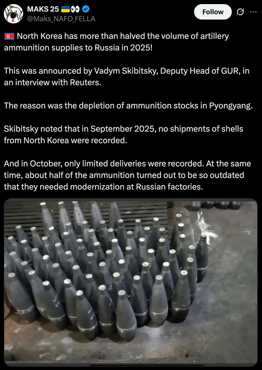 North Korea reduced artillery ammunition supplies to Russia by more than half in 2025 due to depleted stocks in Pyongyang, with no shipments in September and limited deliveries in October. Even then, and a bit laughably, about half the ammunition required modernization at Russian factories because it was so outdated. So North Korea’s stockpiles are severely depleted, it seems. Russia’s running low on munition options.