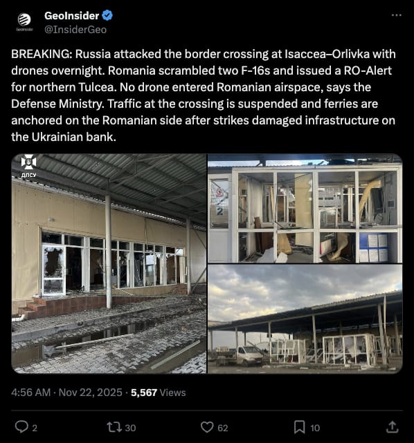 Russia also attacked the Isaccea–Orlivka border crossing between Ukraine and Romania with drones overnight, prompting Romania to scramble two F-16s and issue alerts. Technically, it seems that no drones entered Romanian airspace, so there was no reason to consider it an attack on Romania itself. However, the ferry traffic was halted, and ferries anchored on the Romanian side after the damage on the Ukrainian side.