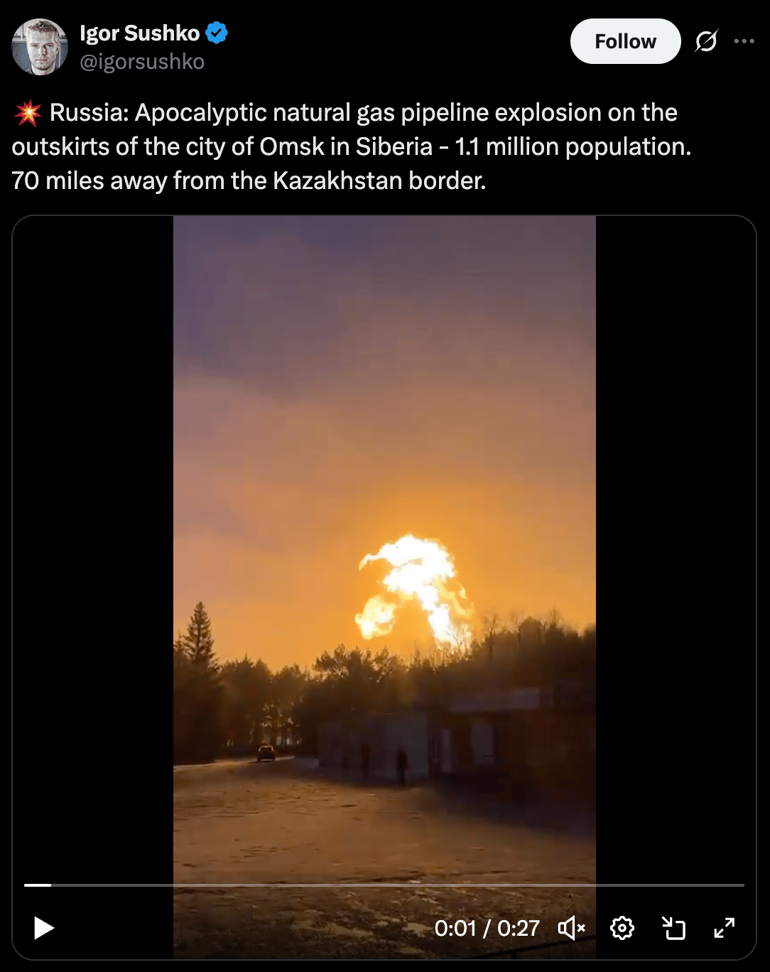 In Russia/Ukraine news, there were a few notable hits on the energy sector. For instance, a major natural gas pipeline exploded on the outskirts of Omsk in Siberia, Russia, near the Kazakhstan border, creating an apocalyptic fire in Omsk Oblast near the village of Rostovka.