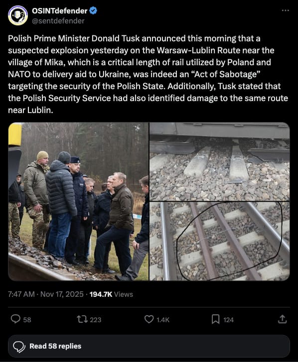 In European news, Polish authorities identified three acts of sabotage on the railway network, including explosives planted by Russian GRU along tracks, a C4 explosion on the Warsaw-Lublin route near Mika village used for NATO aid to Ukraine, and a metal plate with a wired smartphone near Puławy Azoty station; Prime Minister Donald Tusk confirmed state security threats and damage near Lublin, with suspects as two Ukrainian nationals linked to Russian intelligence, one previously convicted in Lviv and the other from Donbas, who entered from Belarus and fled back after the incidents. I am sure Russia felt that these two guys were not going to be caught, and if they were, Ukraine would be blamed, but it’s pretty obvious what is going on here. This feels a lot like NATO is now at a slow-burning war with Russia, and we are starting to see the kinetic effects.