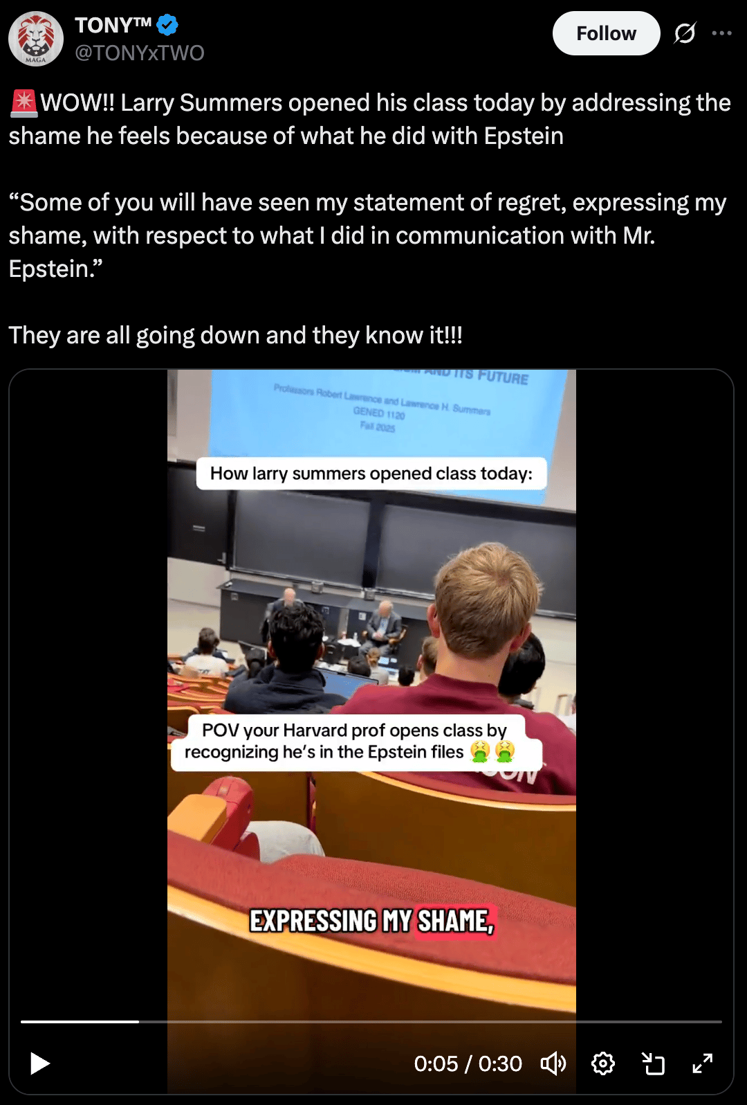 In North American news, President Trump signed the Epstein Files Transparency Act (H.R.4405), requiring the Justice Department to release all Epstein case files within 30 days, except for victim privacy, child abuse materials, active investigations, abuse imagery, or classified national security info, with redactions justified in the Federal Register. President Trump then criticized Bill Clinton and Larry Summers for visiting Epstein's island. But what surprised me is that Harvard president Larry Summers openly expressed shame in a class over his communications with Jeffrey Epstein. I have a feeling a lot of heads are about to roll, and this appears to be a preview of what is going to come! I know the damage will affect some very powerful people, and likely on both sides of the aisle. I say, let ‘em hang and bring the popcorn. 🍿