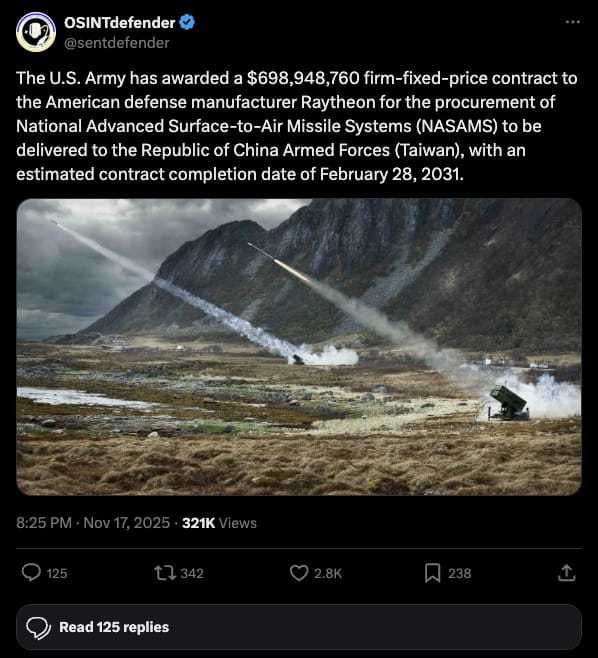 In South East Asian news, the U.S. Army awarded Raytheon a $698,948,760 contract for National Advanced Surface-to-Air Missile Systems (NASAMS) to Taiwan's armed forces, with completion by February 28, 2031. This is a pretty meaningful system to reduce the first-wave effect of cruise missiles and long-range drones, and increase the danger to any human-navigated first strike against Taiwan.