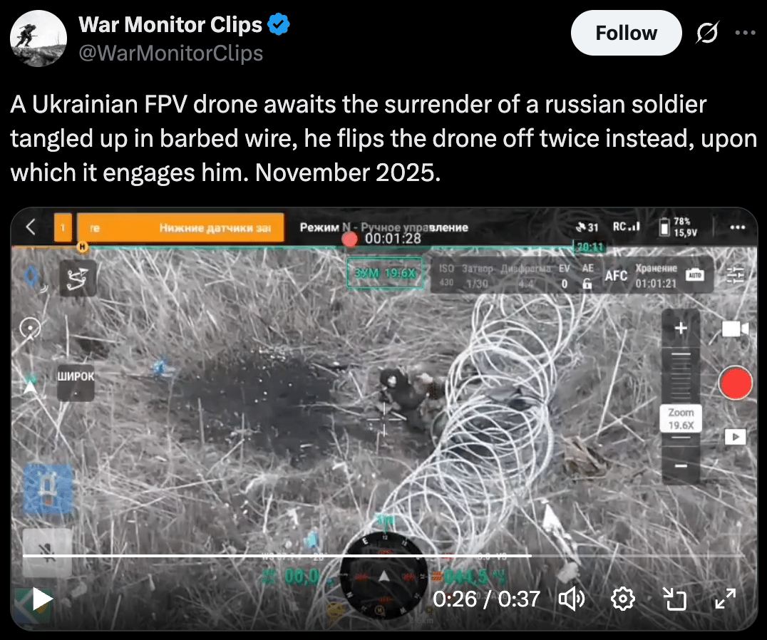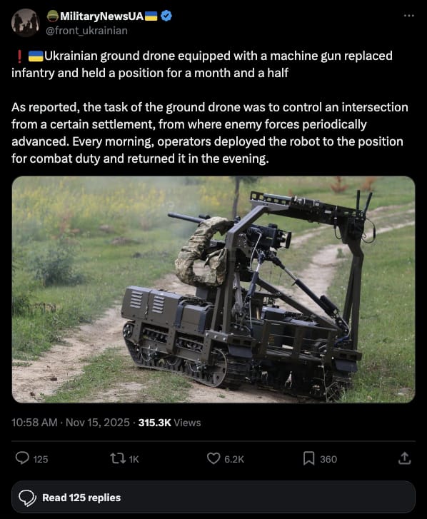 A Ukrainian ground drone armed with a machine gun held a position for a month and a half, replacing infantry to control an intersection from a settlement where Russian forces advanced periodically. Operators deployed it each morning, likely with fresh ammo and batteries, fixed any malfunctioning parts, and retrieved it in the evening. I have been saying for years that remote-controlled guns basically make it impossible for the adversaries to function because of a mix of morale, and because it doesn’t matter if it gets hit. It’s impressive to see it in action.