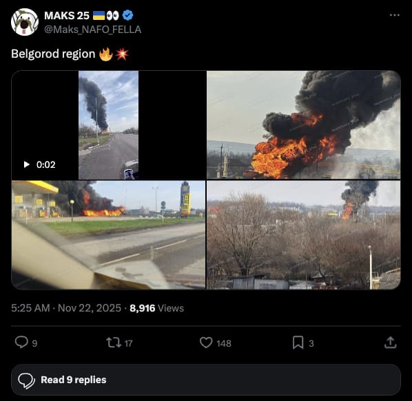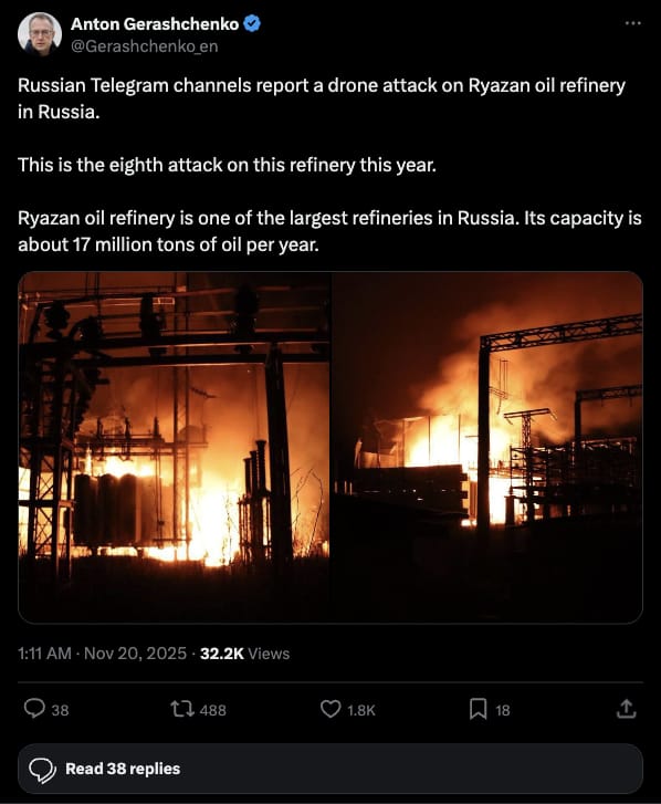 Russian Telegram channels reported a drone attack on the Ryazan oil refinery, marking the eighth such incident this year. The facility processes about 17 million tons of oil annually. But it also shows that the rate at which Russia can get back up and running is around a month, so each facility needs to be planned to be hit at the rate of once a month if they intend to keep them closed.