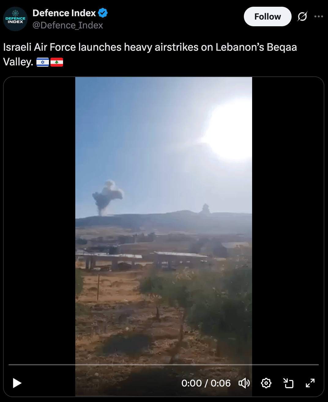 In Middle East news, the Israeli Air Force conducted heavy airstrikes on Lebanon’s Beqaa Valley. So far, we don’t have a lot of information on what their intel is that led to this particular strike, but it is almost certainly Hezbollah locations.