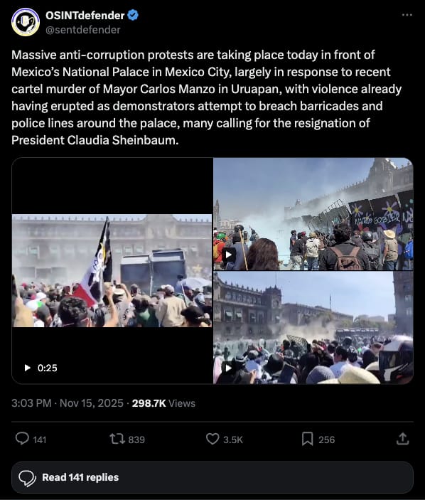 In South of the Border news, thousands protested corruption outside Mexico’s National Palace in Mexico City after the cartel murder of Mayor Carlos Manzo in Uruapan, with demonstrators breaching barricades and riot police in defensive formations, calling for President Claudia Sheinbaum's resignation and labeling her a "narco-president" bought and paid for by cartels. She’s already on the road talking to people on the ground, shaking hands, and not addressing the situation.