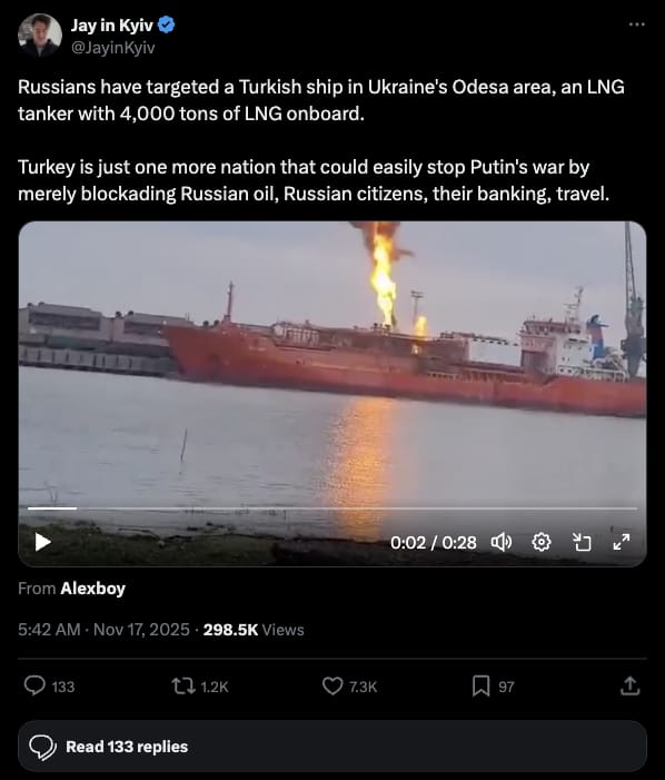 The most notable strike from the Russian forces was the targeting of a Turkish LNG tanker carrying 4,000 tons of LNG in Ukraine's Odesa area. It’s a bit impressive that there is any maritime activity in that area, especially a vessel of this size.