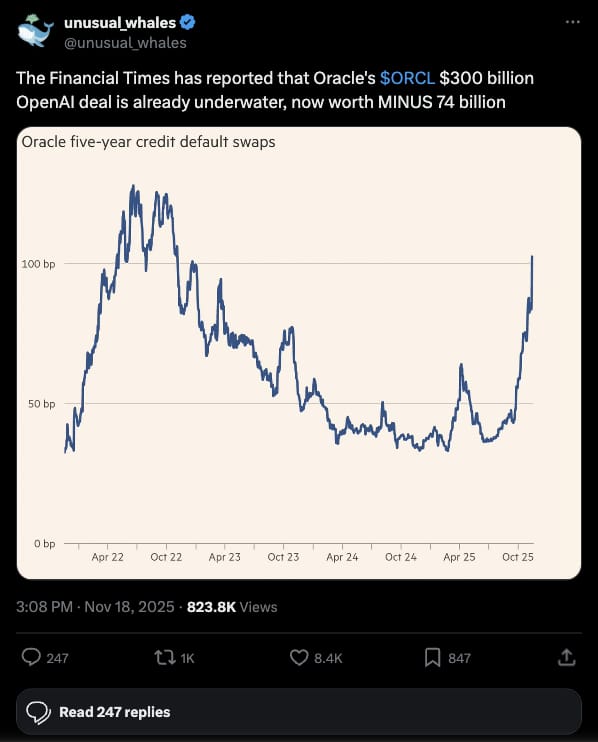 Briefly, in Economic news, Oracle's $300 billion OpenAI deal now values at minus $74 billion, per the Financial Times in credit default swaps. I am not saying that it is definitely bad, but I am saying I strongly think that Oracle should come out and directly address its strategy.
