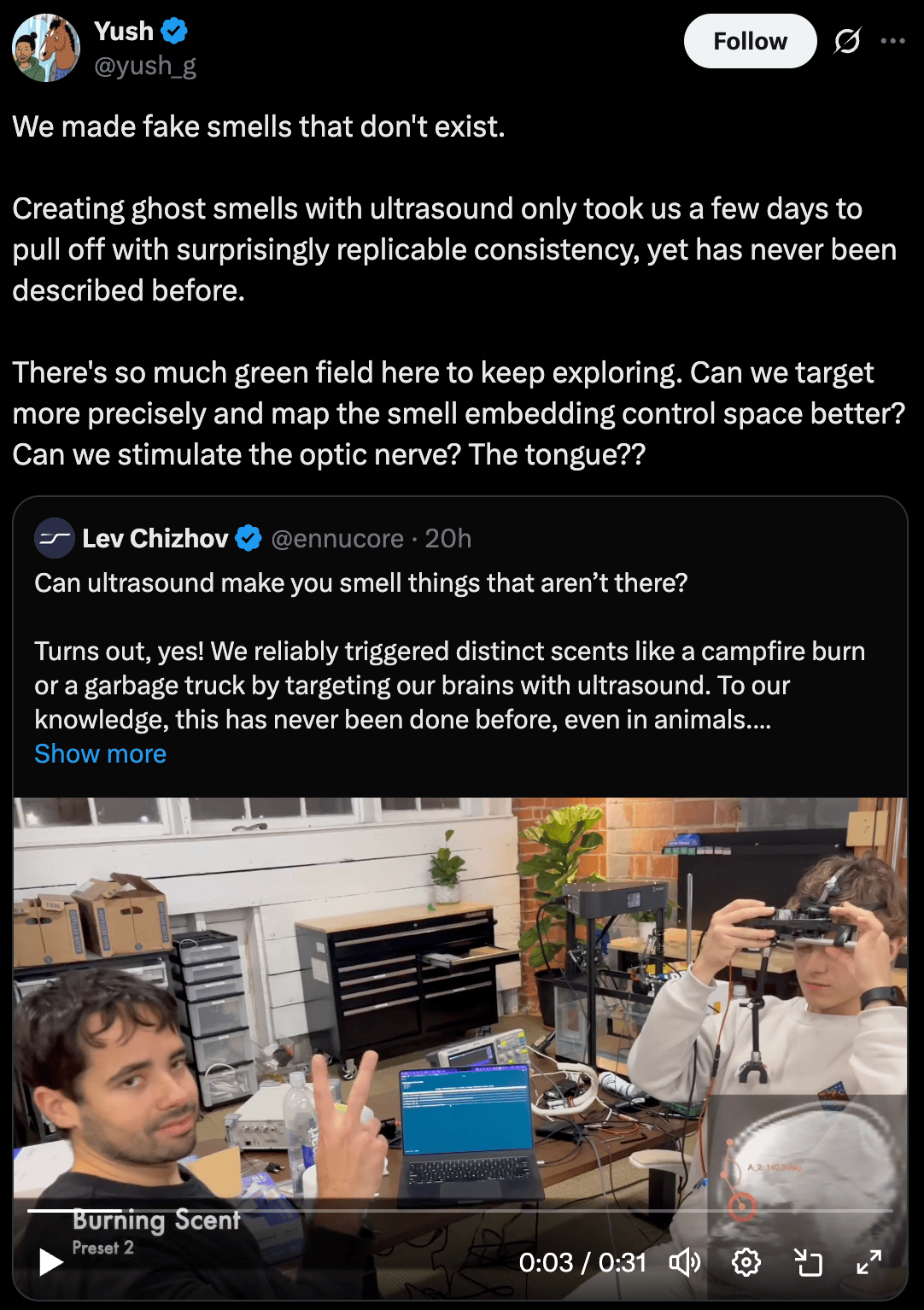 Researchers, in just a couple of days of research, created synthetic "ghost smells" using ultrasound for olfactory stimulation. This opens paths for precise smell mapping and potential sensory expansions to optic nerves or tongues and more. Think of this as one step closer to the holodeck. You could even potentially smell things that are otherwise deadly by mimicking what they might smell like. For instance, if you wanted to simulate a nerve gas or poisonous agent like Mustard Gas, you could do it with this kind of system, theoretically.
