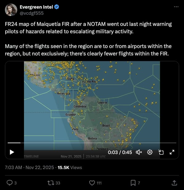 In private talks, it is alleged that President Trump discussed Venezuela's 300 billion-barrel oil reserves, receiving an offer from President Nicolás Maduro for U.S. rights without military action. Trump halted negotiations, but a senior official indicated the same negotiations continue indirectly. Trump is using USS Gerald R. Ford carrier group deployments in the southern Caribbean as leverage in negotiations, undoubtedly. Meanwhile, a NOTAM for Venezuela's Maiquetía FIR warned of military activity hazards, reducing flights in the region. It’s created its own Bermuda Triangle of a kind as ships cannot pass into the region as well. 😆