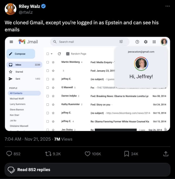 Meanwhile I spotted a searchable Gmail clone preloaded with Epstein's emails became available online. This isn’t the new information that will be released, but it makes it far more accessible to see what was said and released previously, though this comes mostly from redacted documents, and the OCR isn’t that great, so it’s anything but perfect, but still a clever way to allow people to get into the mind of Epstein. I wouldn’t be surprised if this gets a notable update in the next month!