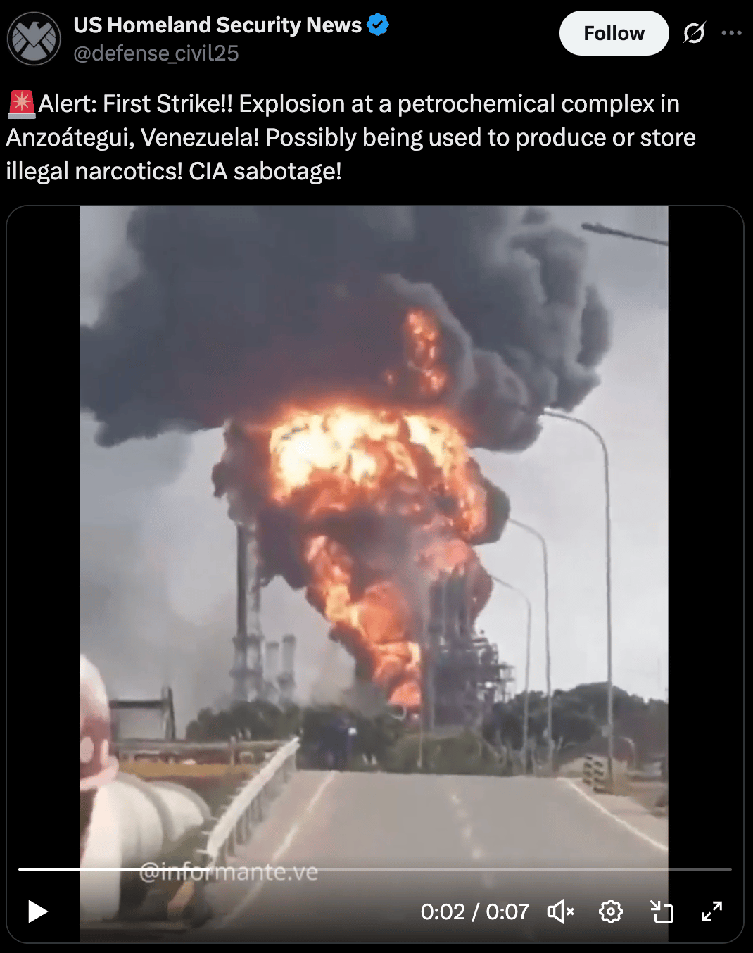 An explosion occurred at a petrochemical complex in Anzoátegui, Venezuela, possibly linked to narcotics production or storage. Either way, it is likely that the US is already on the ground in Venezuela, and special forces are conducting operations there. The Venezuelan Defense Minister says he knows that the CIA is already on the ground there, so I think we can say that this is basically a fact.
