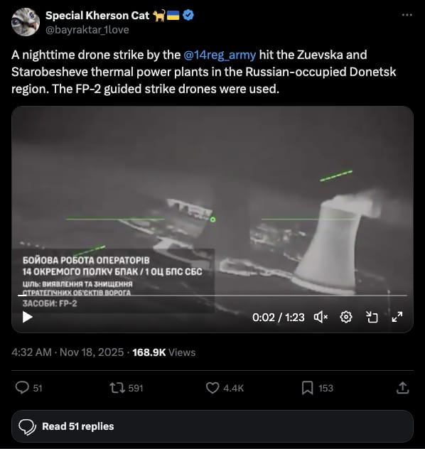 Ukraine's 14th Army Regiment conducted a nighttime drone strike using FP-2 guided drones on the Zuevska and Starobesheve thermal power plants in Russian-occupied Donetsk, knocking out the main transformer at Zuhres TPP and causing a power outage. In this supplemental footage, you can actually see the power getting knocked out in the area when the drone strikes.