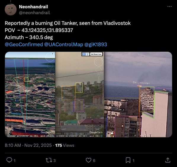 An oil tanker was identified and found burned off the coast of Vladivostok. It was a few kilometers from the OAO NK Alliance oil-loading terminal, but visible from the shore. The environmental hazard here is enormous, but just one of many similar strikes on the region. War is hell on the environment.