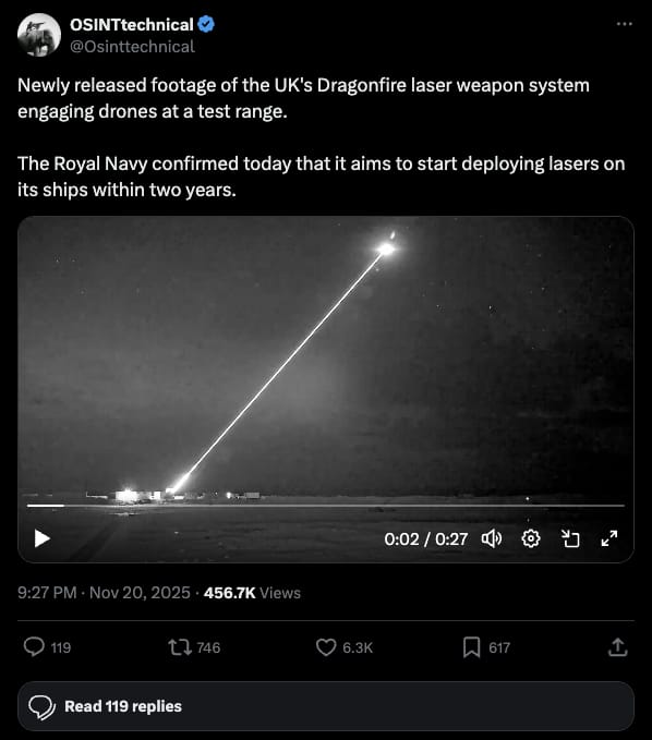 The UK released footage of its Dragonfire laser weapon system destroying drones at a test range, with the Royal Navy planning ship deployments within two years. This may be the only reasonable defense for any guided munitions. Unguided non-explosive penetrator rounds may still be a threat, but those aren’t widely used against ships at the moment; the tech exists to leverage them if militaries decide it’s important to do so. Think hypersonic projectiles, either through rail guns or through ram accelerators.