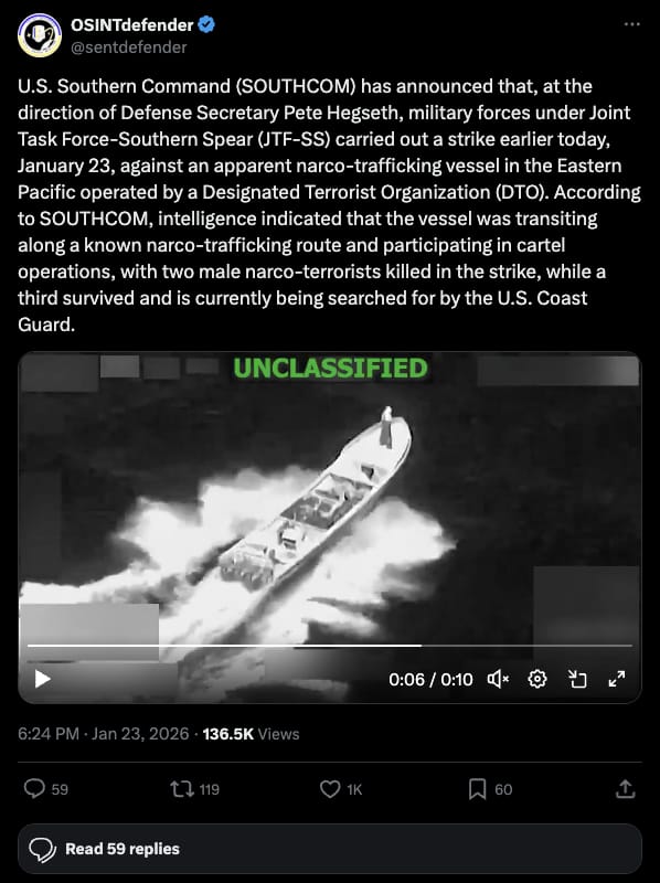 At Defense Secretary Pete Hegseth's direction, U.S. Southern Command's Joint Task Force-Southern Spear struck another narco-trafficking vessel in the Eastern Pacific operated by a designated terrorist organization, killing two male narco-terrorists along a known cartel route. I am a little curious why the cartels keep trying, but perhaps more are slipping through than are getting stopped.