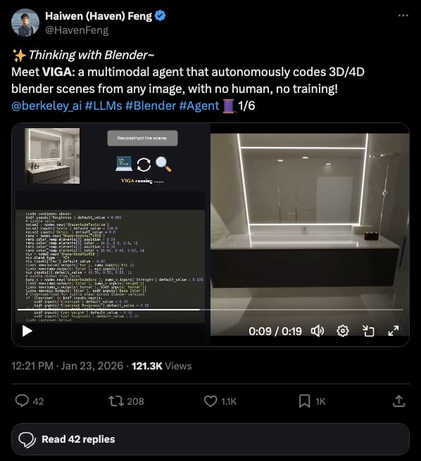 VIGA, a multimodal agent from Berkeley AI, autonomously codes 3D/4D Blender scenes from any image without human input or training. This is a very cool thing that can take a photo out of, let’s say, Nano Banana, Majestic, or Sora, and then convert it into a 3d scene, including the style of the photo. Remarkable.