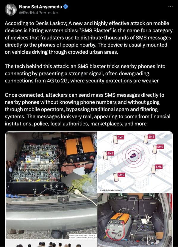 In Tech News, SMS Blaster devices, mounted on vehicles in US cities, distribute thousands of SMS messages to nearby phones by mimicking stronger signals to downgrade 4G to 2G connections, bypassing operators and spam filters. It’s a pretty clever system and a nasty vulnerability that can use messages to impersonate banks, police, or authorities without needing phone numbers.