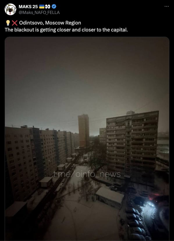 Power outages struck Odintsovo in the Moscow Region, extending blackouts closer to the capital. Keep in mind, this is one week after Ukraine decried large-scale power outages against civilian populations as a war crime. So, I am sure you will be shocked to hear that there wasn’t the same kind of rhetoric about this photo as there were others on the other side of the border. Again, I think it’s all fair in a time of war, which is awful, but that’s exactly what war is - awful. And it needs to be awful so that it dissuades the rest of the world from wanting to engage in it.