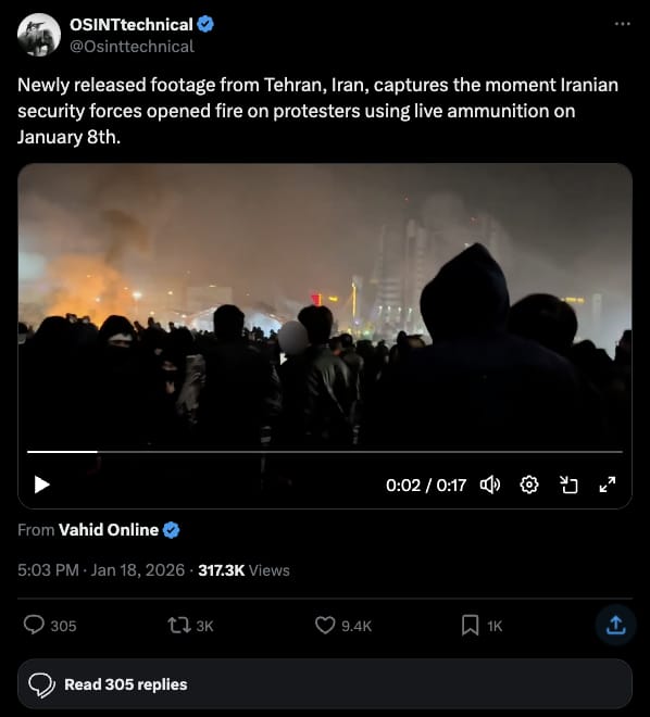 Nevertheless, people are still at it, to some degree, though the streets appear to have been mostly cleared of protesters. Iran's state broadcaster IRIB was hacked, interrupting programming to broadcast a message from Crown Prince Reza Pahlavi urging Iranians to rise against the Islamic Republic. I don’t know if the Iranian people can do that, without external support, because the IGRC, with help from militias around the region, is simply more than a match against a largely unarmed population.